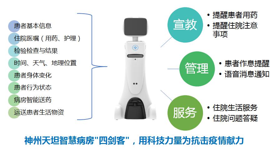 目前,疫情防控已經(jīng)進入最為關(guān)鍵的階段,無數(shù)奮戰(zhàn)在臨床一線的醫(yī)務工作者,正在冒著生命危險與病毒進行戰(zhàn)斗,為構(gòu)筑起防治新型冠狀病毒的信息化關(guān)口,有效降低病毒交叉?zhèn)鞑ワL險,提高醫(yī)護人員工作效率與安全性。神州天坦推出智慧病房"四劍客":患者住院信息服務系統(tǒng),護理信息交互大屏系統(tǒng),移動護理系統(tǒng)與護理查房機器人系統(tǒng),整合先進的軟硬件、物聯(lián)網(wǎng)和人工智能技術(shù),為奮戰(zhàn)在抗“疫”一線的醫(yī)護人員保駕護航。