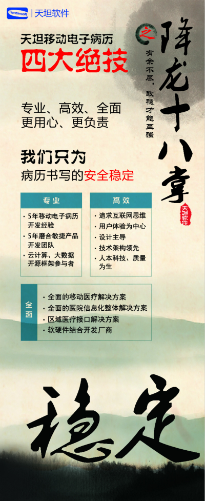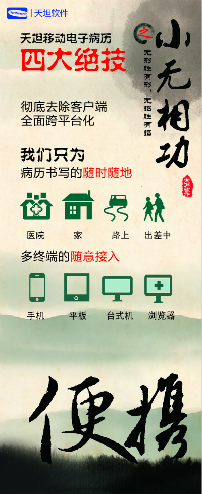 天坦軟件,作為國(guó)內(nèi)移動(dòng)電子病歷的先行者,盛裝亮相京交會(huì)。在會(huì)上展示了以“天坦移動(dòng)電子病歷”為核心的醫(yī)院整體信息化系統(tǒng),受到眾多參觀者的關(guān)注。天坦軟件始終堅(jiān)持以“讓天下沒(méi)有難看的病”為宗旨,致力于醫(yī)療事業(yè)發(fā)展。為中國(guó)醫(yī)療衛(wèi)生行業(yè)的信息化建設(shè)以及個(gè)人健康服務(wù)提供從硬件到軟件、從技術(shù)到服務(wù)的全面解決方案,是中國(guó)醫(yī)療信息化市場(chǎng)中快速成長(zhǎng)的獨(dú)立軟件廠商之一。數(shù)年來(lái),一直堅(jiān)持研發(fā)以移動(dòng)電子病歷為核心的醫(yī)院信息化系統(tǒng),從移動(dòng)框架的病歷編輯器到跨平臺(tái)的移動(dòng)醫(yī)療解決方案,為整個(gè)病歷信息化行業(yè)注入了極強(qiáng)的創(chuàng)新活力。 “天坦移動(dòng)電子病歷”為核心的醫(yī)院整體信息化系統(tǒng)秉承“高效應(yīng)用、信息互通”的基本理念,是專門為醫(yī)院設(shè)計(jì)開發(fā)的醫(yī)療信息化系統(tǒng)的核心組成部分。具有高效、安全、穩(wěn)定、易用、移動(dòng)、智能等特點(diǎn),除此之外,還具有穩(wěn)定、完全跨平臺(tái)運(yùn)行、功能強(qiáng)大、系統(tǒng)性能卓越等巨大優(yōu)勢(shì)。